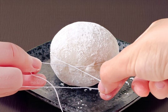 ずっしり重いみかん大福に餅切り糸を通すと、切り口からはじゅわっと果汁が溢れ出します。