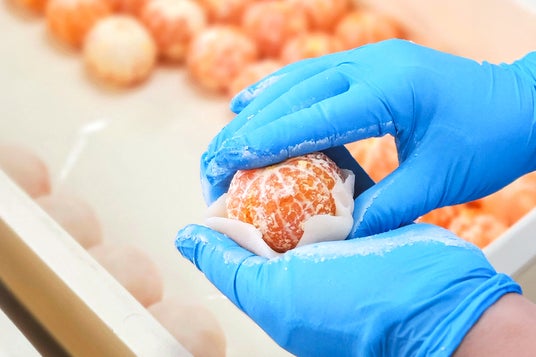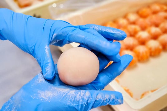 通常のたいようの餅は「もちもちでコシが強く、歯切れが良い」のが特徴ですが、果汁たっぷりで皮の薄い繊細な有田みかんを包むには、よりなめらかで伸びのある餅が必要でした。