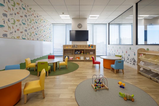 「預けたくなる託児所」:従業員の多くを占める主婦層が安心して働けるよう、子育てと仕事の両立を支援する託児所を完備しています。明るい日差しが差し込み、街の景色が望める保育環境。休憩室からお子さまの様子を確認できる大きなガラス窓を採用しています。