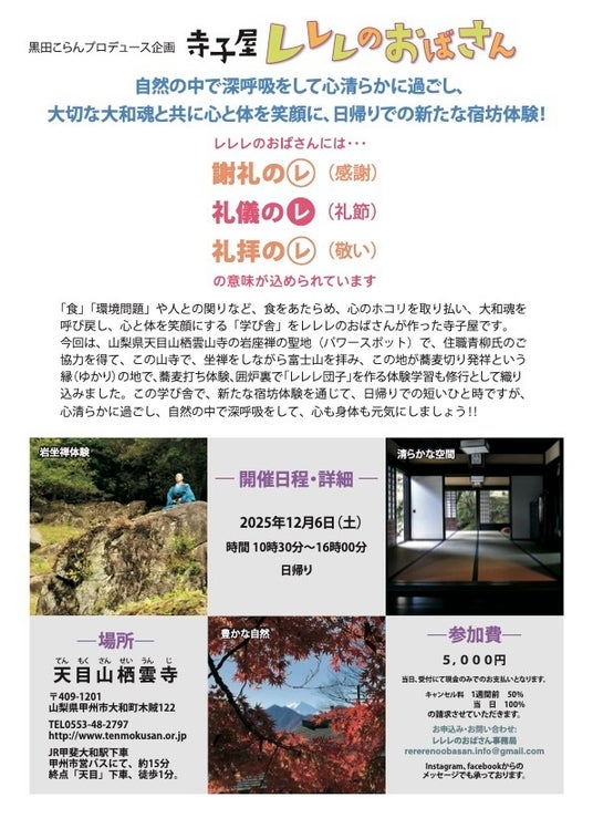 寺子屋「レレレのおばさん」日帰り体験イベントが2025年12月6日(土)、山梨県・天目山 栖雲寺にて開催されます。現在、チケット販売サイト「TIGET(チゲット)」にて、参加チケットを販売中です。