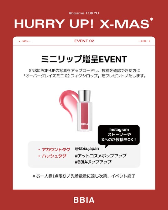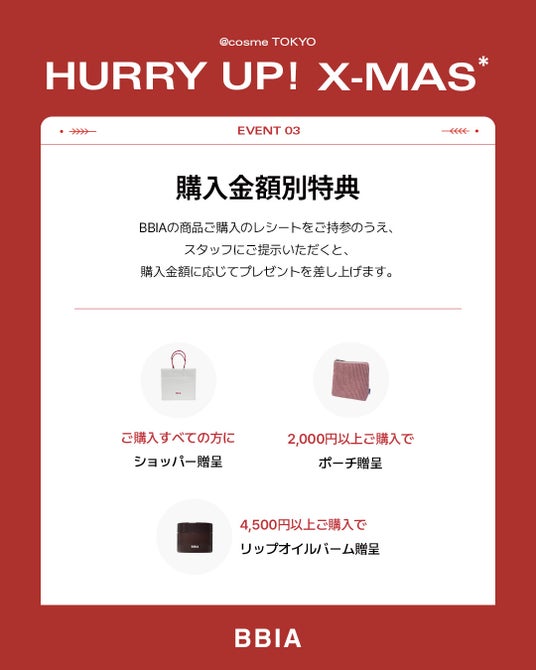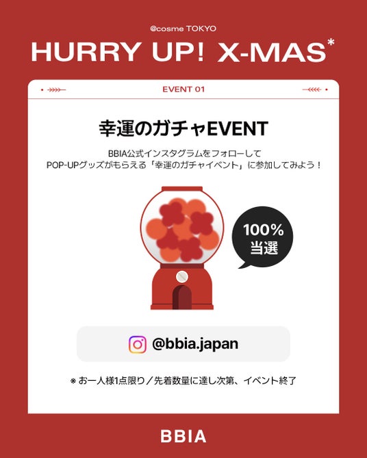韓国コスメブランド「BBIA(ピアー)」は、2025年11月26日(水)~12月2日(火)の期間、@cosme TOKYO2階にてクリスマスをテーマにしたPOPUPイベントを開催いたします。