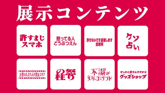 『怒怒怒ランド』は、「怒りを楽しむ体験型の展示会」です。『許すまじスマホ』『不潔のメリーゴーランド』『怒ってる人どうぶつえん』『A型の人立ち入り禁止エリア』『許せないです逮捕します投票所』等の「展示コンテンツ」が展示鑑賞券でお楽しみ頂けます。その他、あそびパスご購入の方は『地面に埋めよう!クソリプ飛ばし』『ぶっとばすぞボンボヤージュ』『ふざけてるとこうなるぞ投げ』『もしかして怒ってます?大会』などのコンテンツもお楽しみ頂けます。