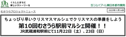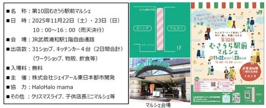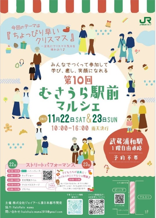 2025年11月22日(土)・23日(日)の2日間、JR武蔵浦和駅前にて地域で活動するHaloHalo mamaと連携し「第10回むさうら駅前マルシェ」を開催いたします。今回のテーマは「ちょっぴり早いクリスマス!」。クリスマスにちなんだワークショップや商品が盛りだくさん。みんなでワクワク楽しい冬の支度をしよう。