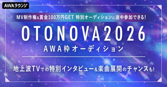 AWA株式会社(本社:東京都港区、代表取締役CEO:冨樫晃己)が運営する、サブスクリプション型(定額制)音楽ストリーミングサービス「AWA(アワ)」は、2018年よりスタートした音楽に本気で取り組む全アーティストによるアーティストバトル『OTONOVA』の2026年開催に伴い、MV制作権&賞金100万円GET 特別オーディションに途中参加できる! OTONOVA 2026 AWA枠オーディションを開催いたします。