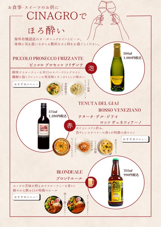 お客様からのアルコールメニューのご要望にお応えして、当社の公式ストア「ビオクル by CINAGRO」でも人気の高い有機認証取得のオーガニックワインと厳選したビールの3種類をご用意し、お食事やスイーツと一緒にお楽しみいただけるようになりました。