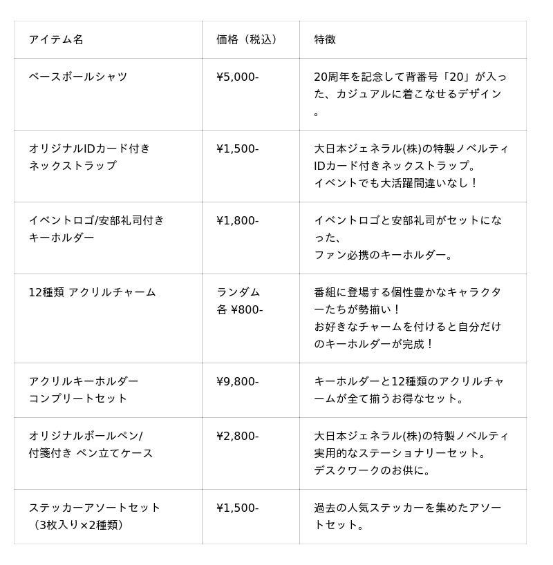 さらに、会場では、安部礼司の番組20周年を記念したオリジナルグッズや、安部礼司らが勤める会社・大日本ジェネラル株式会社の特製ノベルティ、過去に販売した人気グッズの再販なども多数ご用意しています。こちらもぜひチェックしてみてください。