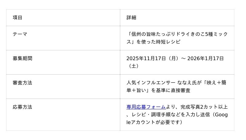 株式会社須坂の暮らし(所在地:長野県須坂市大字日滝、代表:早川航紀)が運営する長野県須坂市のライフスタイル提案プロジェクト「須坂の暮らし」ブランドでは、この度、簡単・時短レシピで人気の料理インスタグラマーななえ|頑張りすぎないおうちごはん(@nanameshi_recipe)と協業し、「信州の旨味たっぷりドライきのこ5種ミックス」を使用した時短レシピコンテストを2025年11月17日より開催します。