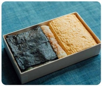 「おだしのうね乃」のだしたっぷりのだし巻き卵が丸ごと1本と海苔弁が一折に。有明の朝摘み海苔の下にはオカカやおだしの染みたからあげなど数種類のおかずが潜む“裏のり弁”!