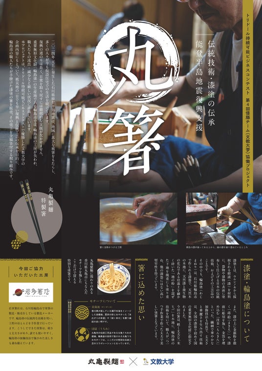 本プロジェクトは、丸亀製麺(株式会社トリドールホールディングス)、輪島塗箸の老舗・岩多箸店(石川県輪島市)、そして文教大学経営学部田中ゼミナールが協働して開発したものです。売上金の全額を能登半島震災復興支援のために寄付いたします。