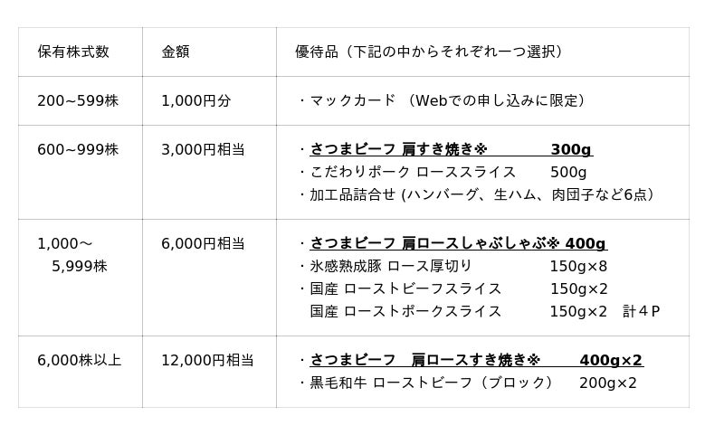 株主の皆様への日頃の感謝の意を込めるとともに、当社グループ事業への理解を一層深めていただくため、従前の優待品についても内容を拡充しつつ、新たに「銘柄豚」と「加工品詰合せ」をラインアップに加えました。株主優待品の詳細およびイメージ写真は以下の通りです。