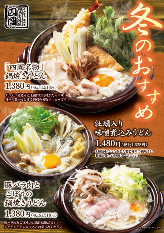 1966年、うどんの本場・香川県丸亀市で「うどん」専門店を開業し、「讃岐うどん」の美味しさを世に広めてきた「饂飩の四國」。冬のおすすめ「うどん」3メニューを11月19日(水)より期間限定で販売いたします。ごぼうと豚肉の風味豊かなお出汁が際立つ「豚バラ肉とごぼうの鍋焼きうどん」に日本の冬の定番うどん「「四國名物」鍋焼きうどん」そして、特製味噌と牡蠣の極上のハーモニー「牡蠣入り 味噌煮込みうどん」でございます。どれも寒い季節に、ほっこり美味しさを感じていただける「うどん」をご用意いたしました。皆さまのご来店をスタッフ一同お待ちしております。どうぞご利用ください。