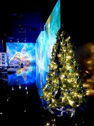 今年は赤やゴールドを基調に飾り付けられた、高さ約2.4mのクリスマスツリーが登場します。壁面の宇宙映像と合わせてお楽しみいただけます。