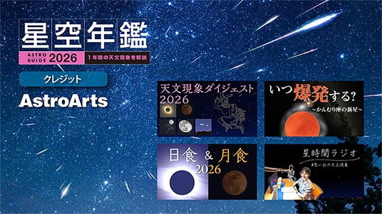 天文ソフト「ステラナビゲータ」の開発や天文雑誌「月刊星ナビ」の発行など天文関係プロダクツの開発会社である、株式会社アストロアーツは、2026年の星空の見どころを写真とイラストで解説したDVD-VIDEO/ROM付きムック「アストロガイド 星空年鑑 2026」を発行しました。