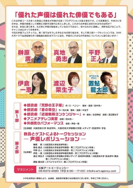 本フェスティバルは、この新時代の声優像を具現化する大阪芸術大学の学生による実践ステージ、教員と置鮎龍太郎氏によるトークセッションの2部構成です。本学はこのフェスティバルを通じて、声優という表現の世界に新たな価値を生み出し、未来のエンターテインメント業界を牽引する人材育成に貢献してまいります。