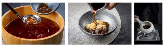 お食事中に「自家製わらび餅」「炒りたてほうじ茶」2つのワゴンサービスを行います。自家製のわらび餅は3種のタレからお選びいただき(きな粉、黒蜜、みたらし)、を使ったデモンストレーションで炒りたてのほうじ茶を香りと共にお楽しみいただけます。
