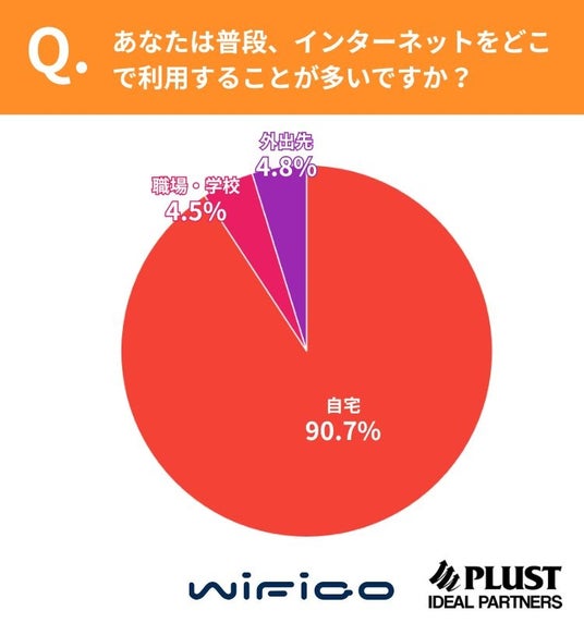 調査では、「普段インターネットをどこで利用することが多いか」という質問に対し、90.7%の回答者が「自宅」と回答しました。一方で、「外出先」と回答した人は4.8%にとどまりました。