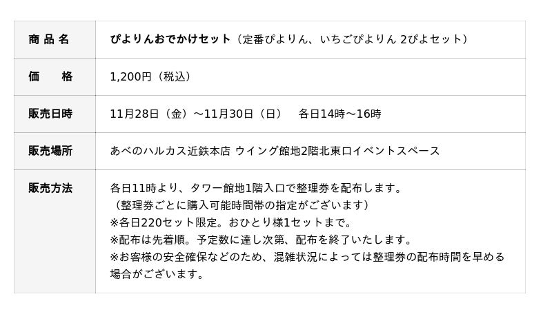 あべのハルカス近鉄本店初登場となるこの機会に、定番の「ぴよりん」と「いちごぴよりん」の「ぴよりんおでかけセット」 を、各日220セット限定でご用意しました。