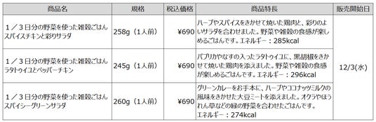 今回発売する「1/3日分の野菜を使った雑穀ごはん」は、不足しがちな野菜を手軽に摂取できるように考えた、温めるだけで食べられる1食分のプレートごはんで、「スパイスチキンと彩りサラダ」、「ラタトゥイユとペッパーチキン」、「スパイシーグリーンサラダ」の3種を発売します。
