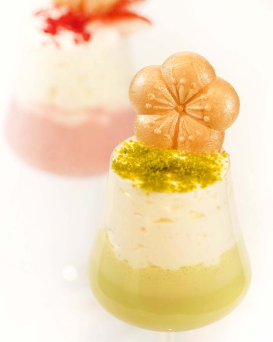 「梅酒カクテルフロート UME PISTA(ウメピスタ) 」は、梅酒とピスタチオとミルクをブレンドしホットに仕上げたベースに、梅ヨーグルトのエスプーマを重ね、ピスタチオパウダーをまぶし、梅最中を添えました。梅の酸味とピスタチオの芳ばしさにミルクのまろやかさが調和したやさしい口当たりの大人のホット梅酒カクテルです。
