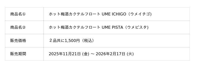 チョーヤ梅酒株式会社 (本社:大阪府羽曳野市、社長:金銅重弘、以下チョーヤ) は、梅酒カクテル専門店「The CHOYA 銀座BAR (ザ チョーヤ ギンザバー) 」にて、梅酒に贅沢苺や濃厚ピスタチオとホットミルクを組み合わせたクリーミーなホット梅酒カクテルフロート「UME ICHIGO(ウメイチゴ) 」と「UME PISTA(ウメピスタ) 」の2品を2025年11月21日 (金) から2026年2月17日 (火) まで期間限定で販売します。冷たい風が頬を撫でる冬に、パステル調のあたたかい色合いのホットカクテルで心ほどける特別な癒しのひとときをお過ごしください。