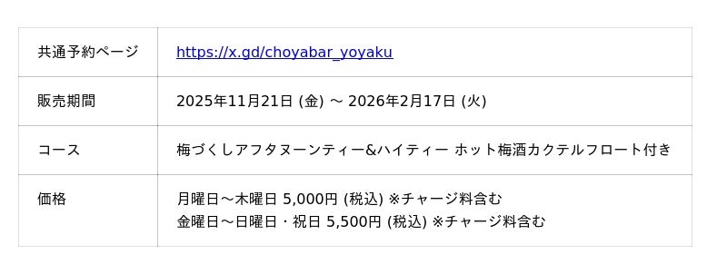 ■2025年11月21日~2026年2月17日100種類以上のドリンクが飲み放題!梅づくしアフタヌーンティーのデザートに!(予約URL: https://x.gd/choyabar_yoyaku )
