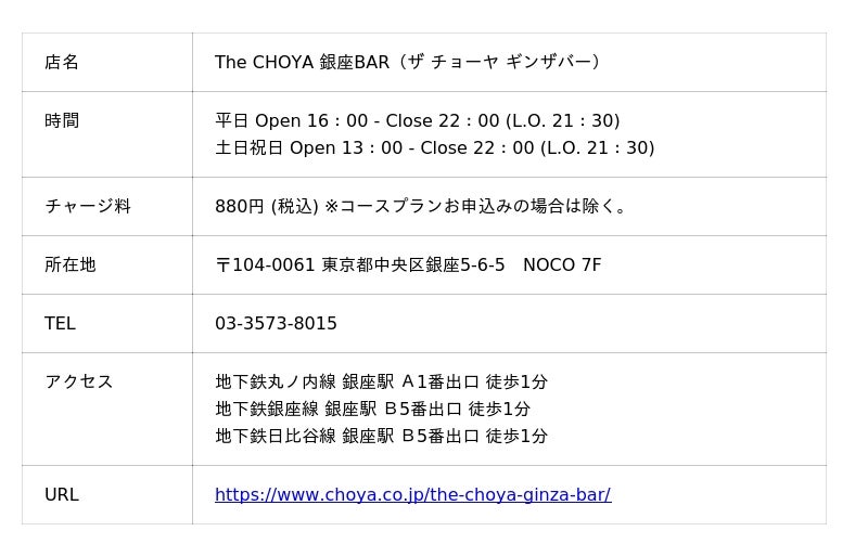 The CHOYA 銀座BARでは、お客様に「常に梅との新しい出会い」をお届けする事をコンセプトにこれからも運営して参ります。梅気分の際には、お気軽にお立ち寄りください。