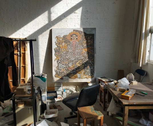 《箱根山の天邪鬼》2025年 石、セラミックタイル、ズマルト、セメントモルタル 116.7cm×91.0cm