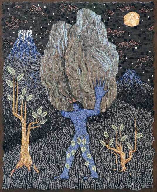 モザイクは油彩画に比べて陰影や細密な描写を持ちません。作家はその「解像度の低さ」に着目し、地域に伝わる民話や神話、伝承の曖昧さや不確かさと重ね合わせながら、作品を制作しています。