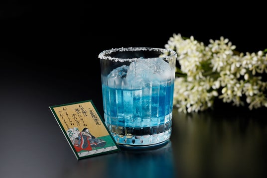 (商品内容)ロックグラスに沈めた氷を沖の石に見立て、ブルーキュラソーとジンで沖の深さと孤独感をイメージ、グラスの淵には潮に見立てたスノースタイルで仕上げています。美しいブルーの色味で、涙にぬれた歌人の切ない想いを表現しています。