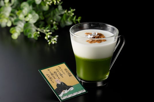 (商品内容)薫り高い抹茶の上にミルクを注ぎ、冬の緑に降り積もる雪の情景をイメージしたノンアルコールカクテル。ホワイトチョコシロップの甘さで恋の余韻を、ほのかに香るバニラシロップで和歌の雅な世界を表 現しています。