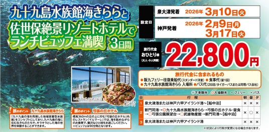 【阪九フェリー関西発団体ツアー】九十九島水族館海きららと佐世保絶景リゾートホテルでランチビュッフェ満喫3日間販売開始!