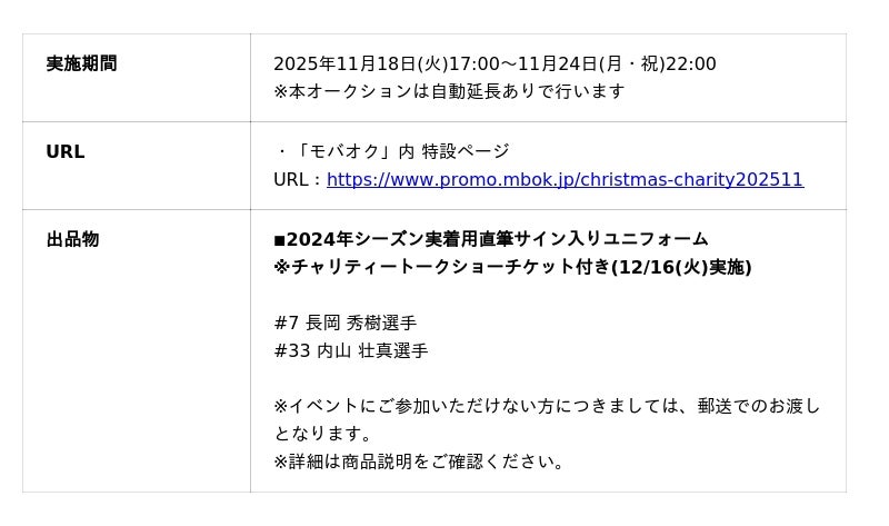 株式会社モバオク(本社:東京都渋谷区、代表取締役社長:小一原 宏樹、以下モバオク)が運営するオークションサービス「モバオク」にて、シーアンドシー株式会社が実施する「長岡秀樹選手×内山壮真選手クリスマスチャリティーオークション2025」を、2025年11月18日(火)から開始いたします。