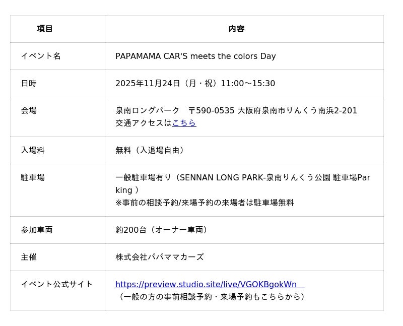 株式会社パパママカーズ(本社:大阪府富田林市、代表取締役:市口 慎太朗)は、2025年11月24日(月・祝)、泉南ロングパーク(大阪府泉南市)にて、初のオーナーズイベント『PAPAMAMA CAR'S meets the colors Day』を開催いたします。
