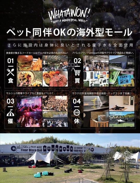 WHATAWON(ワタワン)は、株式会社antiquaが手がける大型商業施設です。大阪府岸和田市に位置し、「ファッション・食・音楽・カルチャー・自然体験・ペット」がひとつの空間に融合する新しい日常の遊び場として、幅広い世代の来場者に親しまれています。