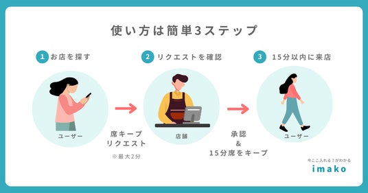 「直前席キープ」は、imakoアプリからお店を選び、簡単な操作でリクエストを送ることで、お店に15分間、席を確保してもらえる新サービスです。「今から行きたい」と思ったその時に、満席を心配することなく、安心してカフェに向かうことができます。
