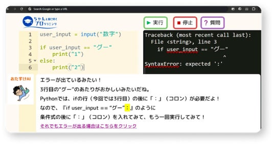 Pythonを使ったプログラムでは、エラーが頻繁に起こります。また、エラーメッセージが英語で出力されるので初めて学ぶ小中学生がつまづくポイントがたくさんあります。ちゃんプロではエラーが発生した瞬間にAIがプログラムを添削してくれる機能を用意しているので、初心者でもつまづかないようになっています。