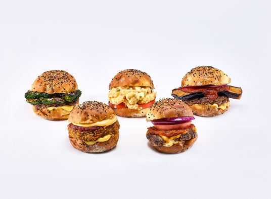 右下から時計回りにネオナイスチーズバーガー/ハムカツグラタンバーガー/ブロッコリーチーズバーガー/海老フライ明太タルタルバーガー/ナスアラビアータバーガー(バンズはすべてプレーン)