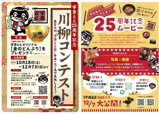 25年間、宇奈ととは“うなぎで元気を届ける”を合言葉に、下町から世界までにこにこ(2525)の輪を広げてきました。25周年の今、川柳で笑って、乾杯でつながって、そして“うなぎ3兄弟”でにこにこ。お客様と一緒に盛り上がる周年企画は、まだまだ続きます!
