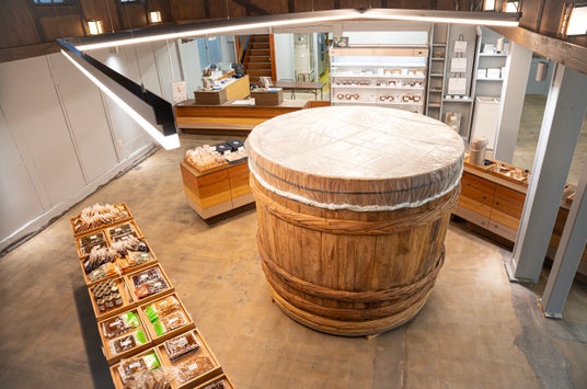 店内には4トンの木桶を展示し、木桶での味噌作りが感じられる店舗に。