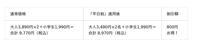 ※「平日割」の対象は一般・シニア料金のお客様です。※「平日割」・「平日学割」はキャンペーン開催期間中の土日・祝を除く平日のみが割引適用となります。※幼児は保護者1名様につき幼児2名様まで。3名様以上は1名様につき990円(税込)頂戴いたします。※学割は学生証ご提示の本人に限り有効です。