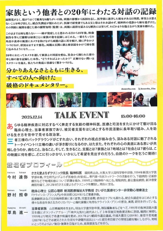 本イベントでは、統合失調症を発症した家族が抱える葛藤に焦点を当てたドキュメンタリー作品を上映したのち、本学心理健康学科の野村照幸教授(公認心理師・臨床心理士)に加え、精神科医、当事者家族の三者が登壇し、「精神疾患を抱える家族の支援」をテーマに意見交換を行います。