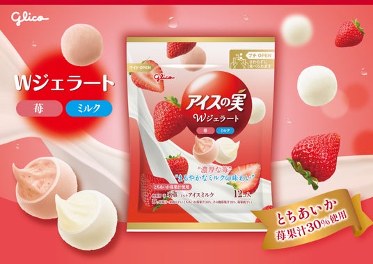 江崎グリコ株式会社は、ぎゅっと凝縮された素材の濃い味わいが特長のロングセラーブランド「アイスの実」から、1袋で苺とミルクの2つの味が楽しめる「アイスの実Wジェラート<苺・ミルク>」を、2025年11月24日(月)より全国にて期間限定発売します。