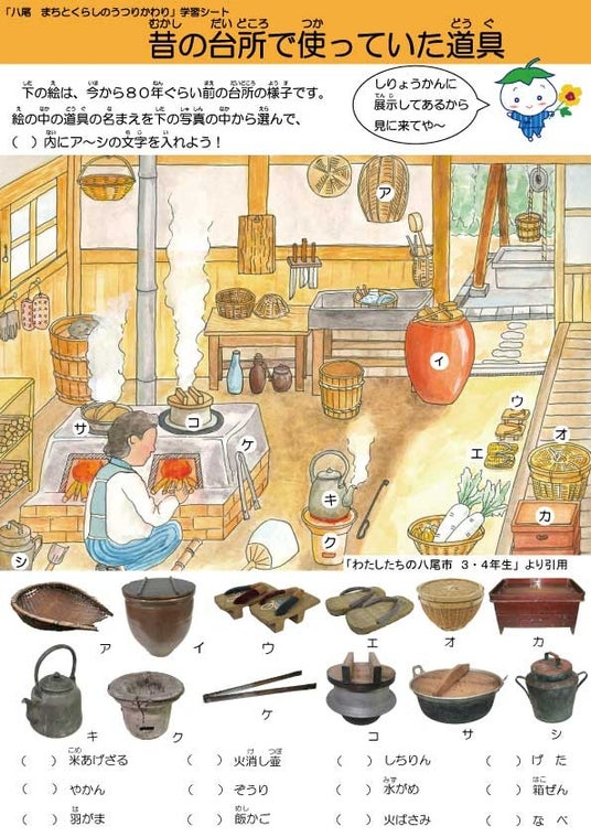 本展は、八尾市の小学3年生が社会科の授業で習う「市のようすとくらしのうつりかわり」の単元にあわせた展示です。社会の副読本『わたしたちの八尾市 3・4年生』のイラスト「昭和のはじめごろの台所のようす」に描かれた昔の道具を中心に展示します。また八尾市域や八尾市内をはしる鉄道のうつりかわりを写真やパネルで紹介します。昔の道具や写真から、くらしのうつりかわりを感じとっていただければ幸いです。
