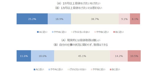 調査の結果、育休取得に対して「1カ月以上取りたい」と考える人は44.1%に上り、取得意欲自体は一定程度高いことがわかりました。しかし一方で、実際の職場環境に当てはめると「現実的には育休取得は難しい」と感じている人が30.2%に達しており、意欲と現実の間に大きなギャップが存在しています。この結果から、育休を取得しやすい制度や職場環境づくりの必要性が改めて浮き彫りになっています。