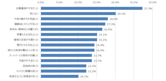 育休取得経験者への調査では、「仕事復帰が不安だった」(27.3%)が最も多く、次いで「特にない」(20.1%)、「今後の働き方を見直した」(18.0%)、「復職後にギャップがあった」(17.3%)、「身体的・精神的に休養できた」(16.5%)といった声が挙がりました。前向きな効果として「育児スキルの向上」「パートナーとの関係改善」なども一定数みられる一方で、仕事復帰やキャリアへの不安を抱える人も少なくなく、育休取得後の支援体制の重要性が明らかになりました。