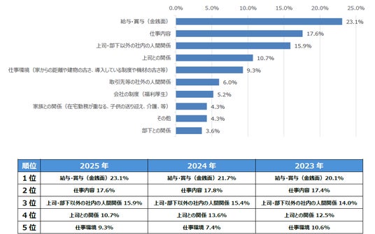 - 勤務先でのストレスとなる要因は「給与・賞与(金銭面)」が 5回連続1位に