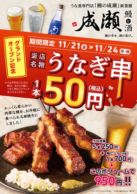 気軽に鰻とお酒を楽しめる居酒屋【鰻と酒 成瀬】グランドオープン記念キャンペーン