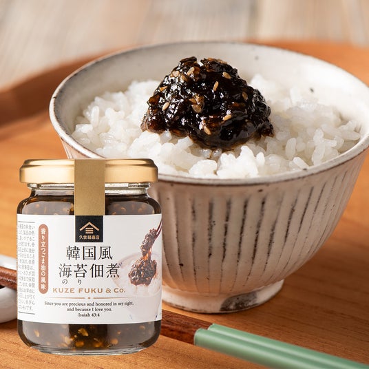 韓国風 海苔佃煮 600 円(税込)炒めたにんにくとごま油の香りが広がる、食欲そそるご飯のお供。コチュジャンのピリ辛がアクセントになり、香ばしさがクセになる味わいです。