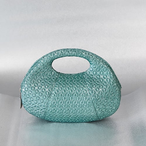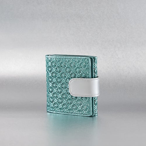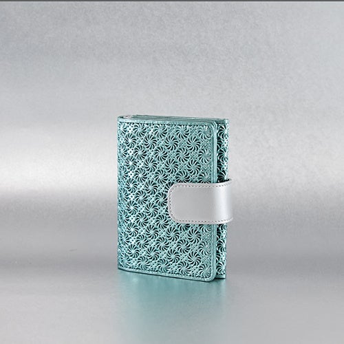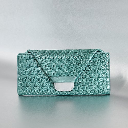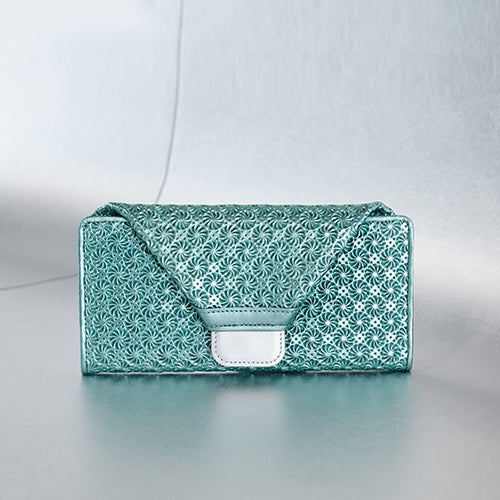 「GIRASOLE(ジラソーレ)」シリーズは、メタリック加工をした牛革に、型押しと型抜きを同時に施した、一見金属のように見える連続的な模様を出したデザインです。