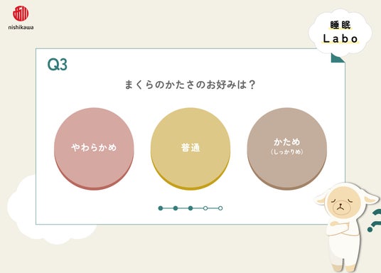 「睡眠Labo」は、nishikawaのオリジナルキャラクター「ひつじのメルくん」※がガイドとなり、6つの質問にお答えいただくだけの簡単な診断です(所要時間60秒程度)。「suyara」「nishikawa睡眠ラボ」「医師がすすめる健康枕」などの#おてごろ西川のまくらとマットレスを対象に、診断結果に合わせておすすめ商品をご提案します。また、睡眠のお悩みに合わせて、nishikawa公式サイトのコラム記事「眠りのレシピ」から解決のヒントなる情報もお届けします。